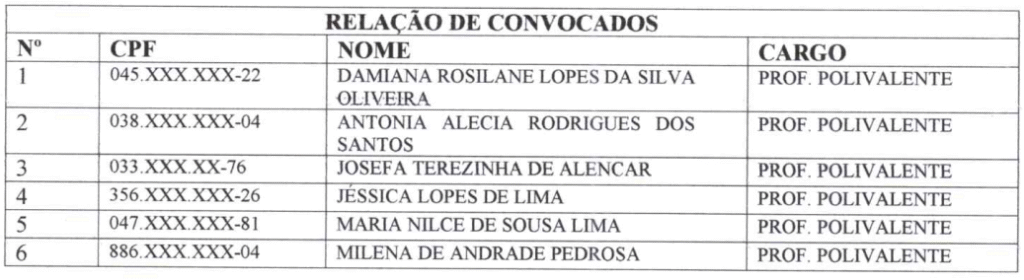 Convocamos os candidatos listados a seguir, conforme a ordem do Termo de Reclassificação (Edital 001/2025), para comparecerem à Secretaria de Educação, Cultura e Tecnologia (Rua Padre Nelson, nº 10, Centro – CEP: 63.170-000). O comparecimento tem por finalidade a LOTAÇÃO dos candidatos, mediante as condições estabelecidas em edital: https://araripe.ce.gov.br/edital-01-2026